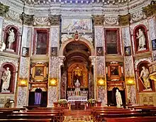 In the chapel of St Cajetan are two canvases by Pietro Damini: a Transfiguration with Theatine Saints and a San Carlo Borromeo heals an ill girl. The canvas of San Carlo before Clement VIII (1622) was painted by Giovanni Battista Bissoni. In the Cappella della Madonna della Purità, are canvases by Palma il Giovane and Alessandro Maganza. In the Cappella del Santo Sepolcro or del Crocifisso, is a depiction of the Flagellation of Christ by Vernansal and a 17th-century wooden crucifix by Agostino Tannini. In the sacristy on the west side of the church are paintings depicting the martyrdoms of St Simone (by blinding) and St Judas Thaddeus (by beating) by Pietro Damini. The bas-relief marble Pietà in the sacristy is by Bartolomeo Bellano and the wooden altarpiece depicting the Prayer in the Garden is by Michele Fabris.