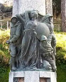In the 1920s, the comune of San Giorgio Morgeto commissioned Fortunato Longo (a sculptor with strong links to the town) to create a memorial for the soldiers killed in the First World War. The resulting monument still stands near the castle. It is a bronze sculptured group, with a winged female warrior in the centre holding sword and shield, symbolising attack and defence. There are three Italian soldiers at her sides. The soldier at her right is in the process of throwing a grenade of the type employed by the Italian army in 1915, the SIPE (Società Italiana Prodotti Esplondenti). The man at her left carries a wounded soldier out of battle.