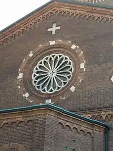 Church San Giulio has a Romanesque Revival and Lombard architectural style, and its front side faces the main square of the town of Castellanza.[2] The key features of the north Italian Lombard Romanesque architectural style are brick and flat and wide facades covering the whole front of the church, often with a big rose window in the middle, above the entrance.[3] The presbyterian pavement (architecture) was built in 1932 and is made of Venetian marble in a mosaic structure. In the pavement are represented geometric figures, and in the middle of these figures is a figure made by squares, with sides of 143 cm.