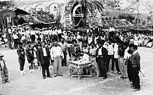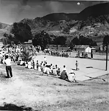 1957, basquetball games award ceremony, patronal fest of San Juan Achiutla. Dressed in dark suit, Raúl Ruiz Bautista