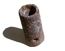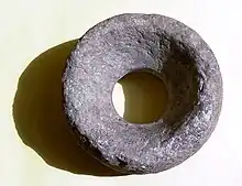 Negrito Stone, Mixtec household utensil used from pre-Columbian times to the 20th century first half, to insert into the center firewood and light in the dark to do chores like grinding nixtamal early in the morning. Basalt. Diameter 13 cm (5.1 in), height 8 cm (3.1 in). San Juan Achiutla