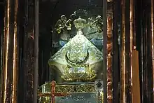 However, by the end of the 16th century, the town was still little more than a group of small houses along with a small hermitage.[3] The hermitage, built by Friar Miguel de Bolonia, was dedicated to the Immaculate Conception. This structure was the first home of a very small image of the Virgin Mary, believed to have been brought to the area from Michoacán either by Bolonia or by Friar Antonio de Segovia.[2][3] Over time, moths damaged the statue and it was packed away in a corner of the sacristy. The image remained there until 1632, when it became associated with its first miracle. After this, the image was taken to Guadalajara to be restored, and it was then returned to San Juan.[2] Pilgrimages to the miraculous image soon began, and pilgrims' valuable offerings permitted the building of newer and grander churches for the image.[2] The first chapel to the image was built in 1638; it is now the Chapel of the First Miracle.[3]