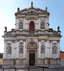 Though in use since 1725 before its completion, San Marco was consecrated in 1760 by Antonio Maria Priuli, Cardinal and Bishop of Vicenza, and dedicated to two saints: it retained the ancient title of St. Jerome and added that of Saint Teresa of Ávila, foundress of the Order of the Discalced Carmelites.[3] It was commonly called "Chiesa degli Scalzi" ("Church of the Discalced").
