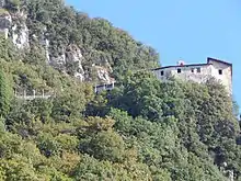 A 13th-century church was located at the site, putatively part of structures protecting the town below from rock falls.[1] In 1530, the Capuchins built a convent at the site. The convent by 1700 housed 22 monks and had a notable library. The church formerly had a marble portal (now stolen) with the inscription: HAC EDEM DIVO NICOLAO EIUSDEM SOCIETAS SCAPITINIENSIS EX VOTO. The church formerly had a 13th-century triptych at the main altar depicting the Adoration of San Nicola, an Annunciation, a Pietà, and a Miracle by St Nicola. The convent also included a novitiate consecrated by the venerable Father Francesco da Bergamo (1536-1626). The church also had altarpieces depicting St Francis of Assisi, St Felice da Cantalice, St Fedele, and St Joseph of Leonessa.