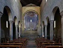 The interior contains both a font and an altar derived from Roman spolia. The sole internal altarpiece is a Madonna, Child, and Saints (1457) by Neri di Bicci.[2][3]