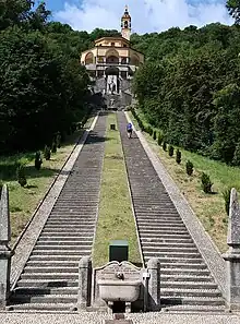 The sanctuary can be accessed via the 392 steps of the Scala Santa. Most are linear steps until the end with a scenic sweep of two arms. At the top is a modern bronze statue of Pope John XXIII by Enrico Manfrini. Below the belvedere, is a crypt with a stucco depiction of the founding miracle.[3]