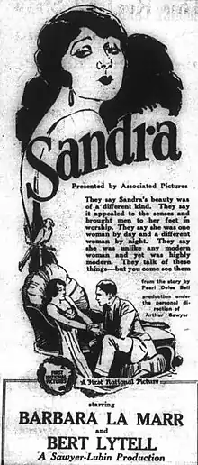 Sandra is a lost 1924 American silent drama film directed by Arthur H. Sawyer and starring Barbara La Marr and Bert Lytell. Based on the novel by Pearl Doles Bell, it was produced by Arthur H. Sawyer and Bernard Lubin's Associated Pictures for distribution by First National Pictures.[1]