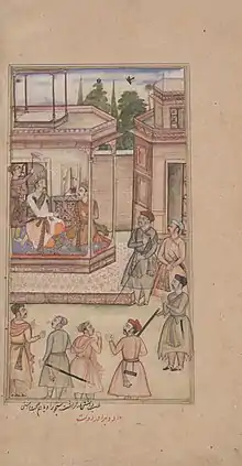 ![]() The blind king Dhritarashtra listens as the visionary narrator Sanjaya relates the events of the battle between the Kaurava and the Pandava clans | |