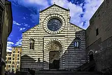 Begun by the Augustinians in 1260, it is one of the few Gothic buildings remaining in the city, after the numerous demolitions in the 19th century. It has a typical façade with bichrome stripes in white marble and blue stone, with a large rose window in the middle. Notable is the ogival portal with, in the lunette, a fresco depicting St Augustine by Giovanni Battista Merano. At the sides are two double mullioned windows.
