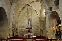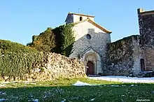 It is designed in Romanesque style. The door is 12th century. The tympanum features the figure of Christframed by a mandorla. The building was in ruins in 1388. Part of the temple was rebuilt in Gothic style. The bell tower was rebuilt in Lombard style, with three floors and a gabled roof. Square in plan, it is decorated with Lombardy arches and pilasters. There is a Gothic apse. The ground floor is covered with a barrel vault and the third floor has mullioned windows with columns and carved capitals.