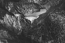 Santa Anita Dam, also known as Big Santa Anita Dam, is a concrete thin arch dam on Santa Anita Creek in the San Gabriel Mountains of Los Angeles County, California. Owned by the Los Angeles County Flood Control District, the dam serves for flood control, water conservation and debris control. The dam is 225 feet (69 m) high and 612 feet (187 m) long, holding 858 acre-feet (1,058,000 m3) of water with a maximum capacity of 1,028 acre⋅ft (1,268,000 m3). The catchment area for the dam is 10.8 square miles (28 km2). The dam was built between 1923 and 1927.[1] The dam has three valves that control releases of stormwater.[2]