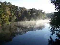 The Santa Fe River is a 75-mile (121 km) river in northern Florida. The watershed of the river is approximately 1,380 square miles (3,574 km2) and spreads across southern Columbia, southern Suwannee, western Bradford, far southern Baker, Union, northern and eastern Gilchrist, and northern Alachua counties.[1] The headwaters of the river are Lake Santa Fe, near Keystone Heights.[2] The Santa Fe River is usually a slow-flowing river. This slow speed, combined with the abundant leaf-drop from nearby trees, especially Bald Cypress, leads to a very dark-brown river due to dissolved tannins.