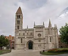 Under the current building foundations have been found remains of a Roman hypocaustum . The church was likely founded in 1095 by Count Pedro Ansúrez, although there are no remains of this original structure. The oldest parts of the current temple date to the late 12th century: the gallery in the northern side of the building and the tower, both in Romanesque style. The tower, one of the symbols of Valladolid, has four floors, the upper three featuring windows, and a pyramidal top.