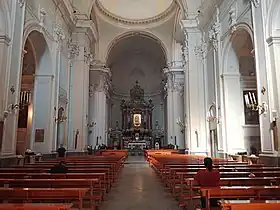 The interior is on a Latin-cross plan. In the first two chapels are canvases by Paolo De Matteis, depicting St Michael Archangel and the Miracle of St Anthony (1693). In one arm of the transept is the Crucifixion with Madonna and St John the Baptist, an 18th-century wood sculpture by Nicola Fumo. An interior chapel, dedicated to Saint Cecilia, was patronized by the musicians from the Real Cappella Palatina.