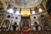 In 1943, during World War II, the interior of the church was damaged by Allied bombardment of the city. Many of the paintings in the church were destroyed. The present building is only the result of a major restoration, utilizing when possible the remnants of the former decoration. The building plan is an elongated dodecagon, circumscribed by an ellipse whose major axis is from the middle of the entrance. The walls of the church are richly decorated with precious Sicilian polychrome marbles by the master Salvatore Allegra, and above, the dome ceiling is decorated with stuccoes by the master Francesco Alaimo.
