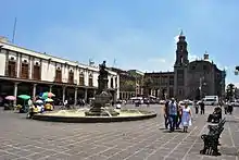 To the south of the church is Plaza San Domingo. It is flanked to the west by the Portal de Evangelistas,[1] which is a Tuscan colonnade with round arches.[2] Scribes with typewriters and antique printing machines work in this Portal.[1] Scribes offer their services to illiterate clients, often offering services similar to that of lawyers, counselors, and financial consultants. A statue of Josefa Ortiz de Dominguez, a heroine of the Mexican War of Independence stands in a fountain in the middle of the plaza. It was sculpted by Enrique Alcati.[2]