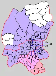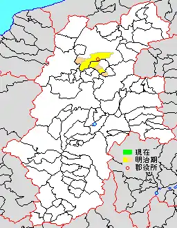 * yellow - areas formerly within the district borders during the early Meiji period