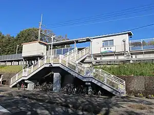 The station has two opposed side platforms on an embankment, with the station building located underneath. The station building has automated ticket machines, TOICA automated turnstiles and is unattended.