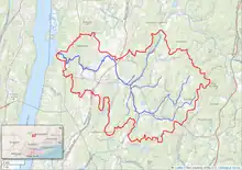 The Saw Kill watershed covers 22 square miles (57 km2),[1] with the stream and its tributaries totalling 54.8 miles (88.2 km).[24] It includes more of the town of Red Hook than any of its other watersheds, stretching from its mouth west to expand enough to include almost all of the village and most of the town west of it. In Milan, the watershed covers a roughly semicircular area of the eastern half of town. The Rhinebeck portion, the smallest of any of the three towns in the watershed, includes the areas around Sepasco Lake and a large swampy area near the Old Rhinebeck Aerodrome from which an unnamed tributary arises.[25]