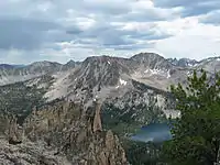 The northern Sawtooth Range formed from the Eocene Sawtooth batholith, while south of Alturas Lake the mountains formed from the Cretaceous granodiorite of the Idaho Batholith.[7][8] The Sawtooth Range has a history of alpine glaciation, but while no surface glaciers exist today, perennial snow fields and rock glaciers remain, usually on north or east facing slopes. There have been 202 perennial snow fields mapped in the Sawtooth Range.[9] The Sawtooth Range was last extensively glaciated in the Pleistocene, but glaciers probably existed during the Little Ice Age, which ended around 1850 AD.[10][11] Evidence of past glaciation given remnants of the glaciers such as glacial lakes, moraines, horns, hanging valleys, cirques, and arêtes.[10]