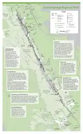 Starting from the south, the trail begins in a parking lot located just north of the Crystal Springs Dam. The southern end of the trail is located on the east side of Lower Crystal Springs Reservoir, near the intersection of Crystal Springs Road and State Route 35,[1] and it generally heads north parallel to the long axis (i.e. north-south) of the reservoir.