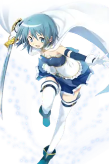 As a magical girl, Sayaka wears a blue skirt with a white cape and gloves. Her weapon of choice is a katana that she is able to produce multiple copies of at a time. She also has a strong regenerative ability due to the healing nature of her wish.[29] Sayaka insists that her wish is selfless and feels that fighting witches to save people is a bonus, even after witnessing Mami's death.[29]