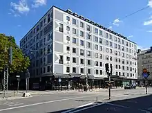 The hotel was built from 1948 to 1951 in place of the Stora Teatern which had been built in 1916 as one of Stockholm's largest film theatres. The hotel was one of the interesting commercial designs of the 1950s designed as modernist architecture. The building was built by Kommunal Hotell AB. The building was designed by Georg Varhelyi and Carl-Axel Acking.[2] Acking's design was classy but raw, for example conservation of space was done with narrow rooms and using couch beds as extra beds.