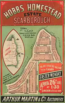 Land sub-division occurred when Scarborough was part of Humpy Bong, Redcliffe. In August 1878 land in the new marine township of Scarborough went to auction, postponed some months until completion of the Scarborough Hotel, in order that perspective purchasers could obtain accommodation in the township while examining the allotments. Advertisements described the beach as "unsurpassed in Australia, having splendid stretches of pure hard sand, perfectly innocent of mud or mangrove. .... a distinctive feature at this northern or Scarborough end should be recognised in the highly interesting chain of crescent-shaped bays, the waters of which wash the township cliffs, affording sheltered coves for boating purposes..."[11][12]
