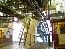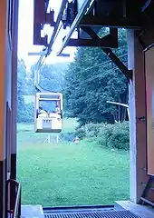 After the war it was eventually decided to build a suspended cable car line from a point close to the intended start point of the previously planned rack railway. The line was privately built and owned, opening on 17 July 1930 after three years of construction. It was built to Professor Benoit's design, using one carrying cable and two traction cables. There were 10 cabins, a maximum of 8 of which could be used at any time, and each cabin carried up to 22 passengers and a conductor.[6]