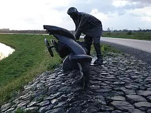 The Schielands Hoge Zeedijk never really collapsed, though the All Saints' Flood of 1570 indicated its weakness.[1] In 1574 it was deliberately cut through in sixteen places during the Siege of Leiden. On 1 February 1953, during the North Sea Flood of 1953, the dike almost collapsed between Capelle aan den IJssel and Nieuwerkerk aan den IJssel; the hole was filled by sailing a ship into the dike, an event commemorated by the monument Dubbeltje op zijn kant ("dime on its edge", a Dutch proverb indicating a dramatic event nearly happened).
