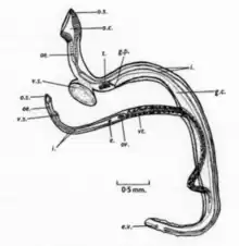 The digestive system lacks a pharynx but has two ceca that combine to form a single tube connected to an esophagus. It also has a bifid intestinal ceca and a foregut with a mouth for eating and excreting.[12] Their osmoregulatory system depends on protonephridial mechanisms with flame cells located between parenchymal cells. These cells form fine tubules that connect and create the excretory bladder, which is located in the posterior part of the body. The bladder opens by way of a terminal excretory pore.[12]