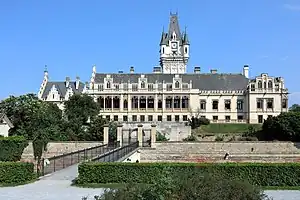 On the west side of the castle, there is a monumental loggia, which was completed in 1863. A few years later, it was decorated with cheerful ceiling paintings and grotesque console figurines. The main tower from 1861 is crowned with so-called bartizans. It is located in front of the west wing towards the castle courtyard. It forms a strong contrast to the slender late Gothic tower opposite on the east side of the castle courtyard.