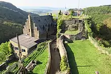 The extensive ruins of the spur castle were underpinned and partly rebuilt in the 19th century. They are on a high hill spur that drops away steeply on three sides. They are almost 100 metres (330 ft) long and 30 metres (98 ft) wide.