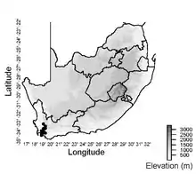 Schoenus dregeanus has been mostly observed from the Cederberg and Worcester areas of South Africa, with additional collections from the Riviersonderend Mountains and the Prince Albert region.[1] This species tends to occur on moist, mountainous habitats sites between 600 and 1400 metres in elevation, and it can sometimes dominate the vegetation in moist areas.[1]