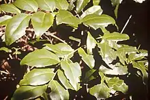The leaves are simple, alternate, and lack stipules.[3] The ovate leaves are 4.5-8.5(-11)cm long by 3–4.5(-6)cm in width, and gradually become narrower towards their end, tapering to an obtuse or subacute (not really sharp) tip. The base is rounded or broadly becomes wider, slightly inequilateral. The texture is firm, almost leathery or like thick paper, and usually sparely tuberculate on both sides. The colour of the leaves is glaucous, pale green to olive; the leaves have a dull sheen when not wet. There is a flat or slightly raised midrib from which 4 or 5 pairs of lateral veins curve towards the apex (never looping back to the midrib), of which the first pair appears at the very base of the leaf. These veins are also flat or slightly raised on both sides. The petiole is 3-5mm long.[7]
