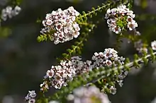 The erect, spreading to decumbent shrub typically grows to a height of 0.2 to 1.5 metres (0.7 to 4.9 ft).[1] The evergreen leaves are 4 to 9 millimetres (0.157 to 0.354 in) in length.[2] It blooms between November and May producing pink-white flowers.[1] Each flower has a diameter of 8 mm (0.315 in).[2]