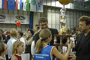 Slovenian minister of education Milan Zver and CEO of Zavod ŠKL Vojko Korošec presenting the trophy to primary school winners