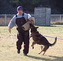 - Protection phase: The judge has an assistant, called the "helper", who helps test the dog's courage to protect itself and its handler, and its ability to be controlled while doing so. The helper wears a heavily padded sleeve on one arm. There are several "blinds" on the field, and the helper hides in a random blind. The dog is directed to search all the blinds for the helper. When it finds the helper, it indicates by barking. The dog must guard the helper to prevent them from moving until recalled by the handler. There follows a series of exercises similar to police work where the handler searches the helper and transports them to the judge. At specified points, the helper either attacks the dog or the handler, or attempts to escape. The dog must stop the attack or the escape by biting the padded sleeve. When the attack or escape stops, the dog is commanded to "out", or release the sleeve. The dog must out or it is dismissed. At all times the dog must show courage to engage the helper and the temperament to obey the handler while in this high state of drive. The dog must show enthusiasm. A dog that shows fear, lack of control, or inappropriate aggression is dismissed.