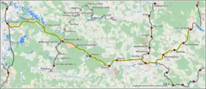 The line then runs through Neubäuer forest and meets the Regen river near Roding and follows it to Cham. Near Chammünster the line branches off the line to Lam to the north east and follows the Chamb through the Cham-Further depression to Furth im Wald and continues to Plzeň.