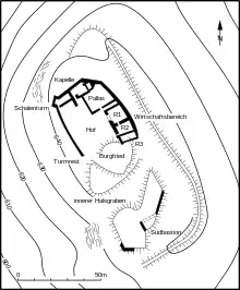Along with the Kastelburg, the less well known Schwarzenburg is one of two ruined castles owned by the town Waldkirch. The ruins of the former hill castle, 656.2 m (2153 ft) above sea level on the top of the Schwarzenberg ('Black Mountain'), a spur of the Kandel have decayed to such an extent that only a few wall foundation are visible.