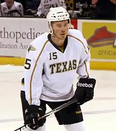 On July 13, 2010, Glennie was signed to a three-year entry-level contract with the Stars.[4] After his season with Brandon was over, Glennie joined the Texas Stars of the American Hockey League (AHL) for the final few games and playoffs of the 2010–11 AHL season, playing in four games and recording no points.[2] Glennie made his National Hockey League (NHL) debut during the 2011–12 season with the Dallas Stars. He played in a single game, without recording any points.[2] With the exception of his one game at the NHL level, Glennie had spent his entire professional career with the Texas Stars until the end of the 2014–15 season.[2] During the 2013-14 AHL season, Glennie scored a career-high 15 goals and 28 points in the regular season, along with 10 points (six goals, four assists) in the postseason en route to the Stars' Calder Cup Championship run. This led to a one-year contract renewal.[5]