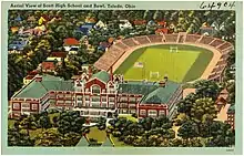 The TPS board approved a resolution in November 2013 to have new stadiums built at Scott and Woodward High School after their previous facilities were torn down during renovation and construction.[8] They were built in time for the 2014 season.[9] Scott previously had two stadiums: a 10,367-seat stadium named after Fred L. Siebert that was demolished in February 1970 when it was condemned,[10] and a roughly 4,000-seat replacement that was dedicated in 1971.[11]