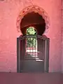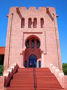Shortly afterwards it was announced that the Los Angeles architectural firm of Hunt and Burns had been employed instead. They produced a Moorish Revival style structure based loosely on one of the gatehouses to the Court of the Lions at the Alhambra in Spain. Sumner P. Hunt and Silas Reese Burns were well known for their designs in the California Spanish Mission Revival architecture style, but decided instead to base their design on a connection between the Spanish building tradition of New Mexico and that of the Moors in southern Spain.[4] There are also obvious similarities with the Southwest Museum, in Los Angeles, which was being designed by Hunt and Burns around the same time, including the tower, without the Islamic entry.