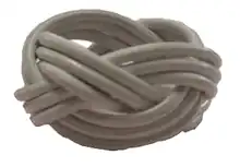 Lexden Woggle worn by PLTU attendees. The woggle is a five-Turk's head knot with three strands, and is usually made from white plastic insulated wire.