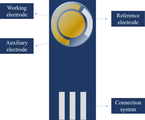 The three electrodes could be printed on different types of substrates (plastic or ceramic) and could be manufactured with a great variety of inks.[2][3] The most common inks are those composed of silver and carbon, however, they can be based on other metals such as platinum, gold, palladium or copper. In addition, the electrodes can be modified with enzymes, metallic nanoparticles, carbon nanotubes, polymers or complexing agents.[2][3] The electrode ink composition is chosen according to the final application and the selectivity and sensitivity required for the analysis.[2][5][6]