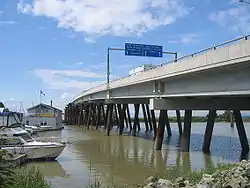 Completed in August 2001, the concrete beams, atop the exposed steel piles driven into the river, support the concrete girders. This low-level three-lane bridge, parallel to the Moray Bridge, carries westbound traffic toward the Vancouver International Airport (YVR). The Ministry of Transportation and Infrastructure for BC owns and maintains the structure.[2][3] However, the joint exercise was a partnership of the Vancouver International Airport Authority, the province, the federal government, and the City of Richmond.