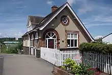 Following the takeover, a new stationmaster's house was built at Sea Mills, at a cost of £240. The stationmaster is recorded as having kept a variety of farm animals and sold eggs to passengers.[6] Increased levels of traffic saw the line through Sea Mills doubled in the early 1900s,[19] and the opportunity was taken to rebuild the station. A second platform opened on 6 January 1907 to the west of the tracks to serve northbound trains. The original platform now exclusively served southbound trains, and was lengthened to 330 feet (100 m), the same length as the new platform. A station building was constructed on the original platform in a domestic style, with an arched terracotta entrance, spar-covered walls and a high-pitched tiled roof. The building contained a booking hall, booking office, toilets and a ladies' waiting room. A smaller building on the northbound platform contained a general waiting room. The subway under the bridge over the River Trym was also built at this time, with the porter's job being expanded to include washing the rubbish out of the subway after high tide, for which the railway provided a hosepipe and Wellington boots.[6] By 1910 there were 17 trains from Bristol to Avonmouth and 15 back, increasing to 21 and 19 respectively by 1920, though not all stopped at Sea Mills. The station was completely closed on Sundays.[18]