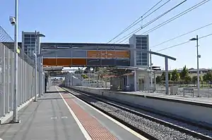 The station has two side platforms connected via an overhead walkway. Lifts and stairs enable passengers to move between the walkway and the platforms. A 550 space park & ride area is provided, as well as a kiss & ride facility. A train stabling depot and maintenance facility has been provided adjacent to the station.[5]