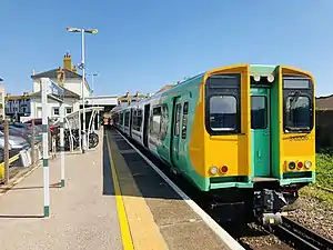 Seaford railway station is in Seaford, East Sussex, England. It is the terminus of the Seaford branch line of the East Coastway line, 58 miles 77 chains (94.9 km) measured from London Bridge.[1] The line to the station has been reduced to a single track and only one platform remains in use (previously two), though it is still numbered platform 2. Platform 1 is still visible but the track has been removed.