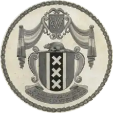 From its founding until 1654, the Dutch settlement of New Amsterdam did not have its own seal. Because it was managed by the provincial governor of New Netherland, it used the seal of New Netherland.[8] After incorporation in 1653, which granted New Amsterdam its own government, the city requested a seal from the Dutch West India Company, which owned and ultimately managed the province of New Netherland.[9] A proposal for a coat of arms of New Amsterdam had been put forward as early as 1630; it featured beavers in the role of supporters, an acknowledgment of the importance of the trade in beaver skins to the growing economy of the province. The beaver was also the prominent element of the seal of New Netherland. However, this design was rejected.[10] The Dutch West India Company instead chose a design that featured the company's insignia on a mantle and a single beaver over a shield emblazoned with a modified version of the arms of Amsterdam. The original full-color rendering of this first official symbol of the city has since been lost, but historians have conjectured that, on the shield, the central pale was black, the three crosses were white, the field was red, and the bands bordering the central pale were either gold or white, in keeping with the heraldic rule of tincture. The draped mantling at the top was likely a tricolor of orange, white, and blue, referencing the flag of the Netherlands in use at the founding of New Amsterdam.[11]